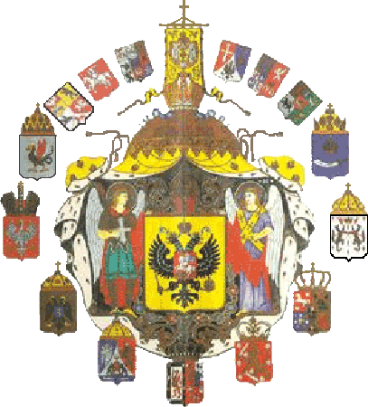 В золотом щите черный двуглавый орел, коронованный двумя императорскими коронами, над которыми такая же, но большего размера, корона, из-под которой выходят развевающиеся концы ленты андреевского ордена. Государственный орел держит в лапах скипетр и державу. На груди орла помещен московский герб: в красном с золотыми краями щите св. Георгий в серебряном вооружении и голубой мантии, на серебряном, покрытом багряной с золотой бахромой попоной, коне, поражающий золотого с зелеными крыльями дракона копьем, также золотым, с восьмиконечным крестом на вершине древка. Щит увенчан шлемом князя Александра Невского. Намет черный с золотом. Вокруг щита цепь ордена св. Андрея Первозванного. Щитоносцы - архистратиг Михаил и Архангел Гавриил. Сень золотая, коронованная императорской короной, вышитая российскими орлами и подбитая горностаем. На сени красная надпись "С НАМИ БОГЪ". Над сенью возникающая государственная хоругвь, с древком, увенчанным восьмиконечным крестом. На золотом полотне хоругви изображен средний государственный герб, но без девяти окружающих его щитов. Главный щит окружен снизу девятью щитами с гербами владений, увенчанными соответствующими коронами. Над ним еще шесть щитов с территориальными гербами. |